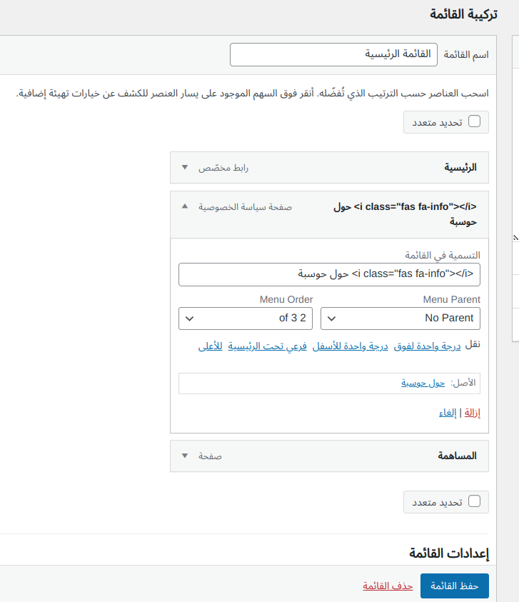 مثلًا يمكنك إضافة أيقونة "حول" إلى رابط موجود في قوائم موقعك كما ترى في الشكل التالي من صفحة القوائم أو Menu: