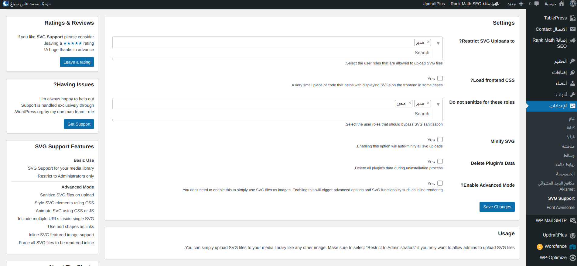 انتبه إلى أن ملفات SVG هي ملفات خطيرة؛ إنها تسمح بتنفيذ بعض السكربتات داخلها، وبالتالي يجب ألا تسمح لمن هب ودب برفعها على موقعك. لهذا يمكنك رؤية بعض إعدادات الأمان للإضافة من خياراتها مثل تقييد رفع صور SVG على المستخدم الأدمن فقط + تنظيف ملفات SVG من السكربتات عند رفعها: