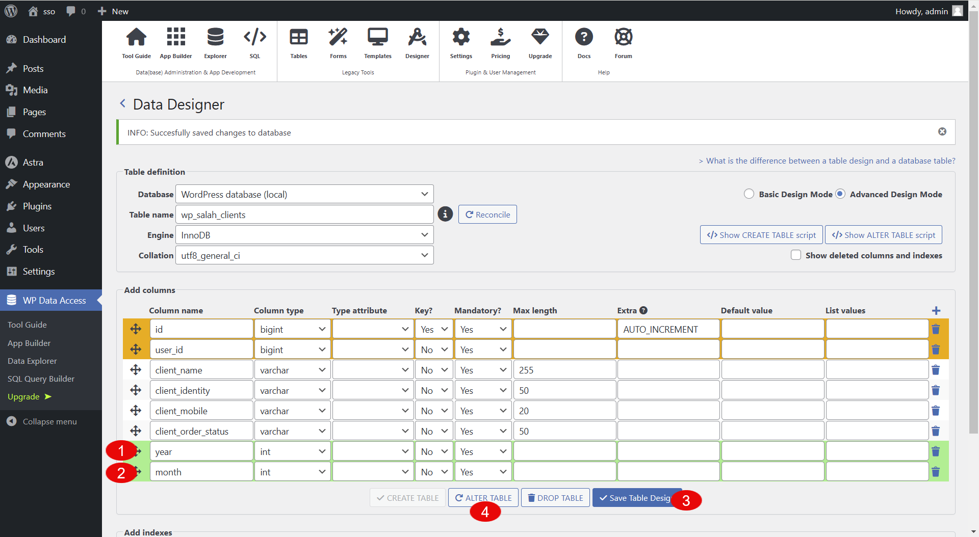 1 – من الـ table definition أدخل اسم للجدول في خانة Table Name، ويفضل أن تجعله يبدأ بنفس البادئة لبقية الجداول لديك في قاعدة البيانات. البادئة لدى wp_؛ ولذلك جعلت اسم الجدول wp_salah_clients.