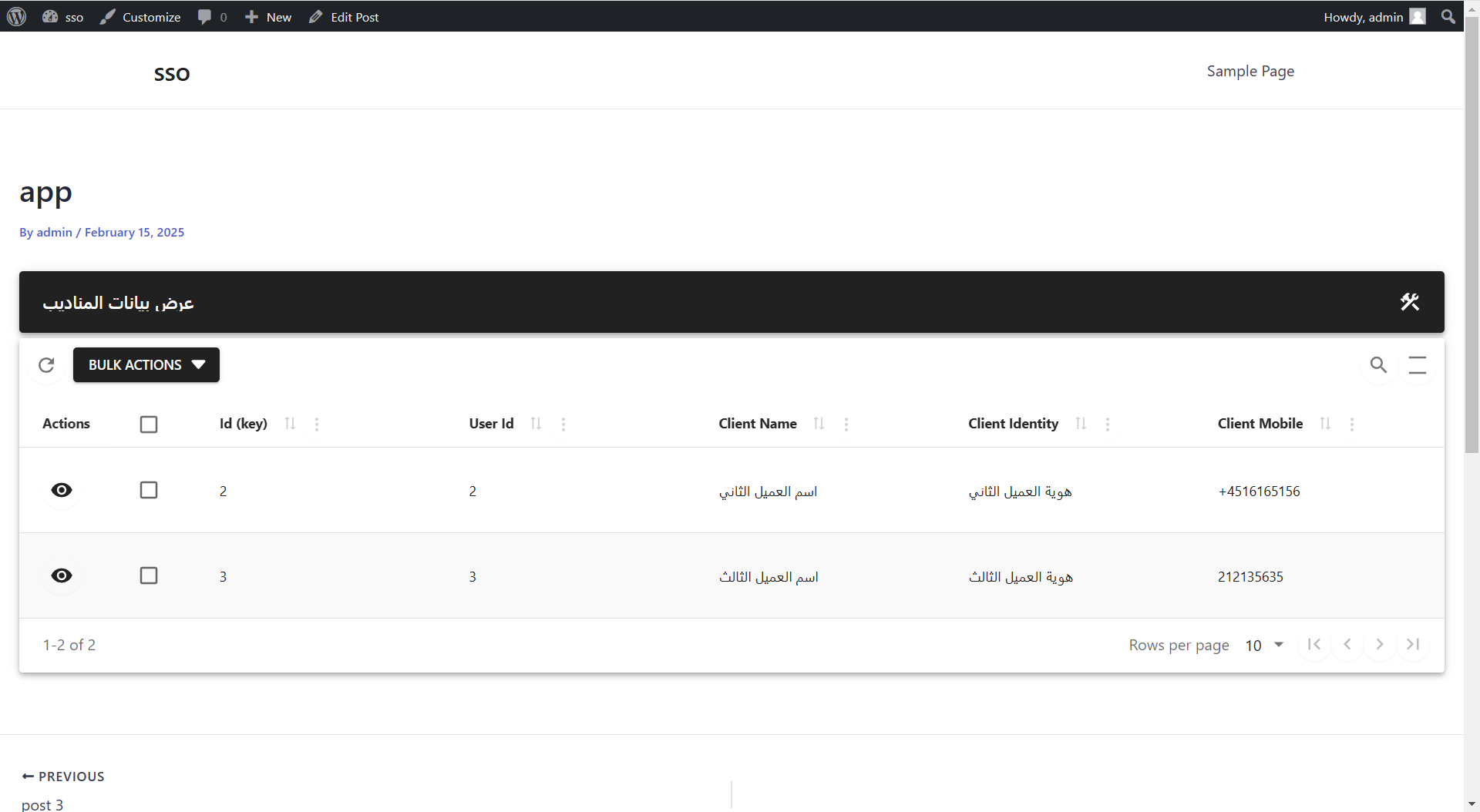 عند استعراض الصفحة من قبل المستخدم الذي يحمل المعرف الفريد رقم 2 يتم استعراض بياناته فقط