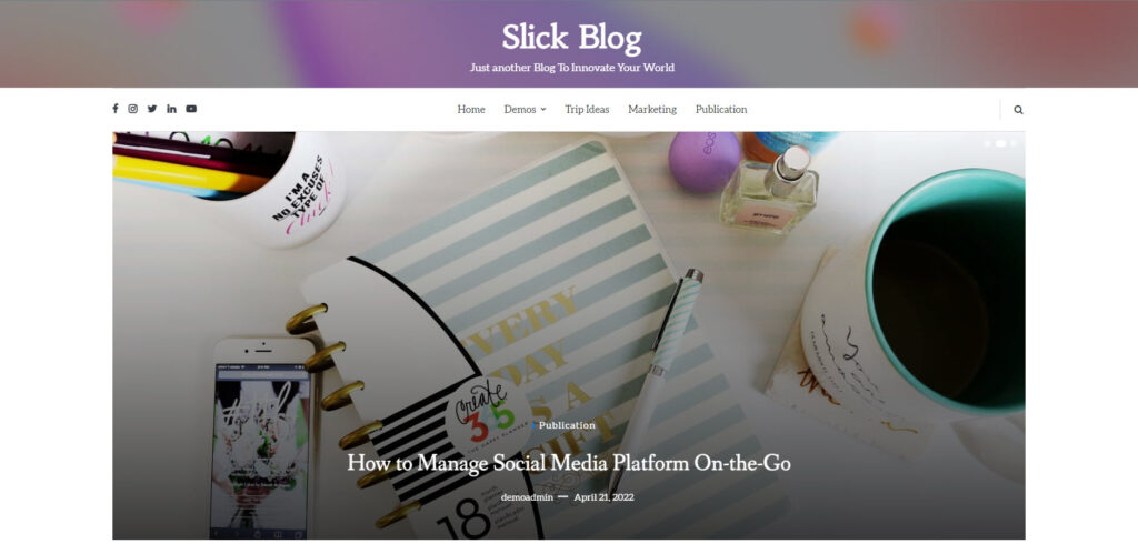 القالب الثاني ضمن قائمة أفضل قوالب ووردبريس عربية مجانية للتدوين هو قالب Slick Blog وهو قالب يمتاز بالبساطة والرقي في طريقة عرض الصفحات الرئيسية والمقالات، وبالتأكيد يدعم الكتابة RTL بشكل كامل.