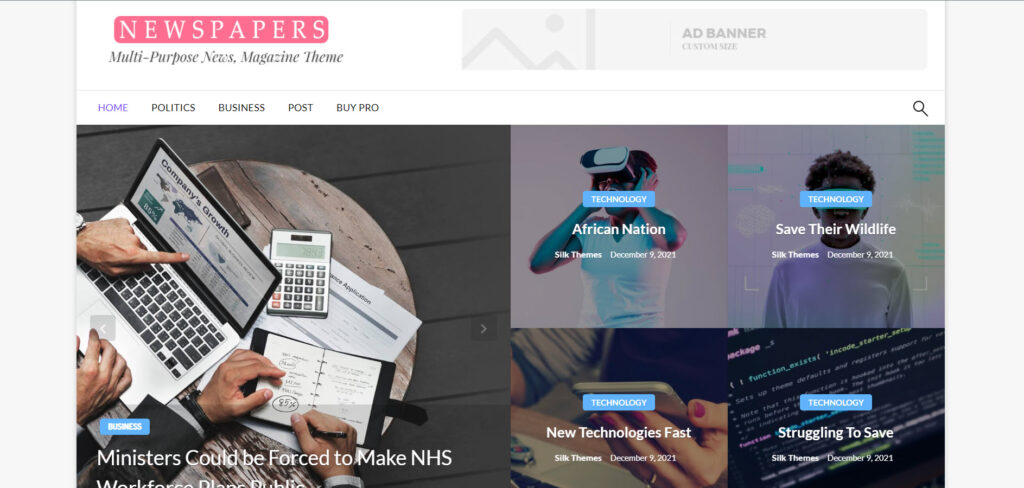 قالب Newspaperss هو احد قوالب ووردبريس العربية المجانية المتكاملة الذي يوفر لك كافة الاحتياجات الأساسية لإنشاء مدونة إلكترونية إحترافية، حيث يوفر لك أكثر شريط متحرك ديناميكي بأكثر من طريقة عرض مختلفة وكذلك إمكانية تقسيم الواجهة الرئيسية بأكثر من نموذج جاهز يساعدك على عرض كافة مقالات الموقع الإلكتروني بشكل منظم.