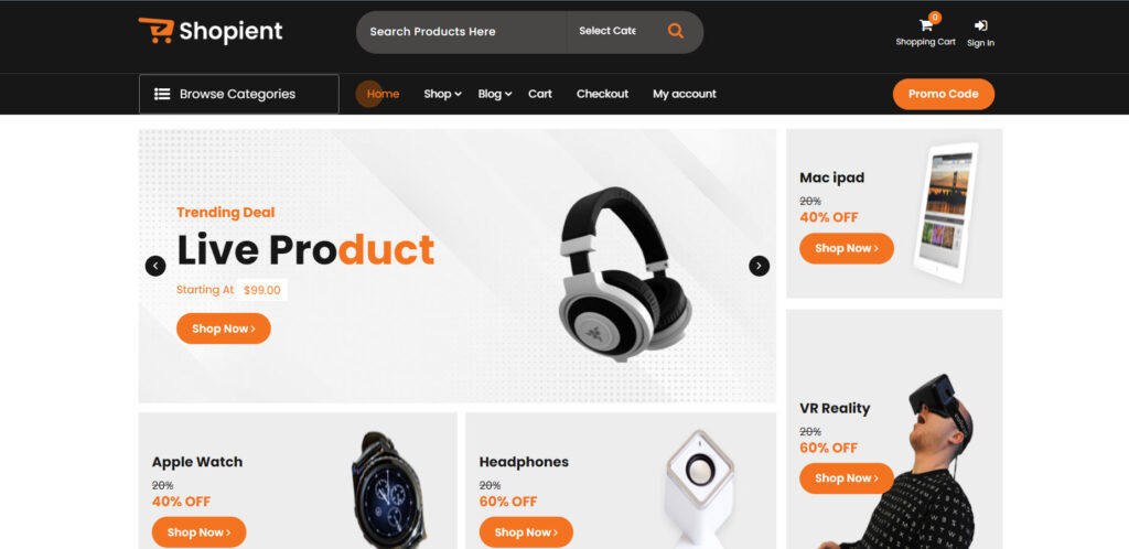 قالب Shopient من أحد قوالب ووردبريس العربية المجانية المتخصصة أيضًا في إنشاء المتاجر الإلكترونية، حيث تتميز بواجهة أمامية متقدمة تساعدك على عرض منتجات متجرك الإلكتروني بشكل احترافي.