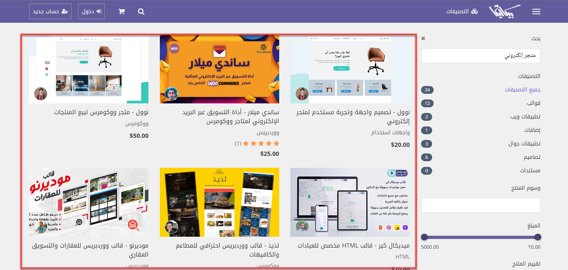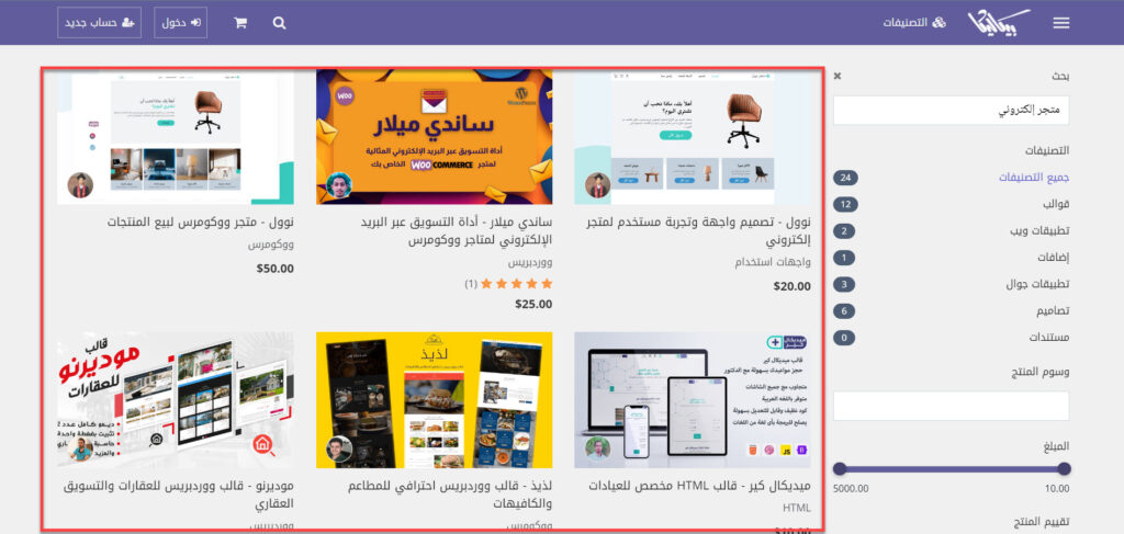 ومن أجل شراء قالب جديد على منصة بيكاليكا تقوم بالدخول إلى موقع بيكاليكا وبعد ذلك تقوم بكتابة التخصص أو تصنيف القالب الذي تحتاج إليه في خانة البحث وبعد ذلك ستظهر لك مجموعة من الخيارات المتاحة فتقوم بمقارنة القوالب من حيث المميزات وتقييم المبرمجين والسعر وتحديد الأنسب لاحتياجات موقعك الإلكتروني وذلك كما موضح في الصورة التالية: