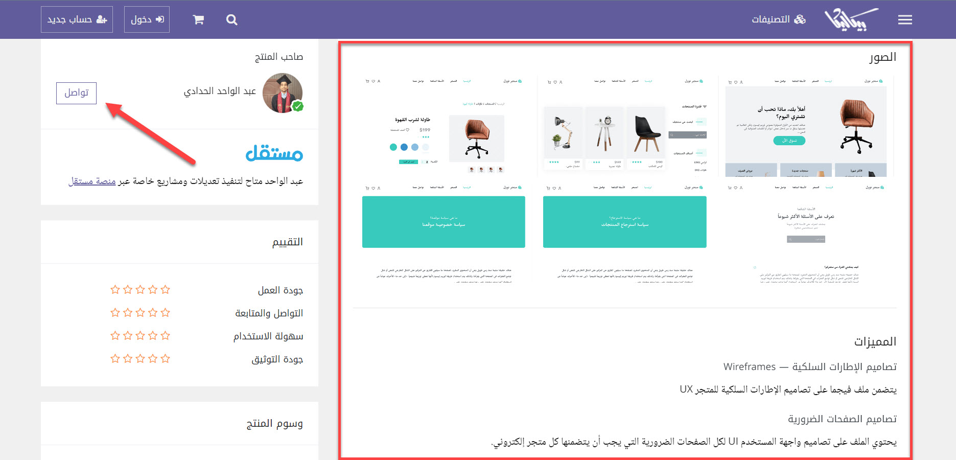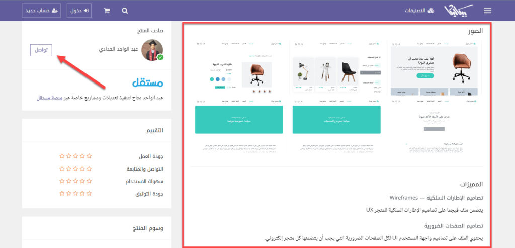 بعد ذلك تقوم باختيار القالب المناسب لموقعك الإلكتروني وستجد صفحة القالب توضح كافة مميزات القالب الرئيسية وصور صفحات القالب كذلك، مع إمكانية التواصل مع مصمم القالب وطلب تعديلات على القالب والاتفاق على المبلغ المالي للتعديلات من زر التواصل المتاح بجوار صاحب المنتج كما موضح في الصورة التالية: