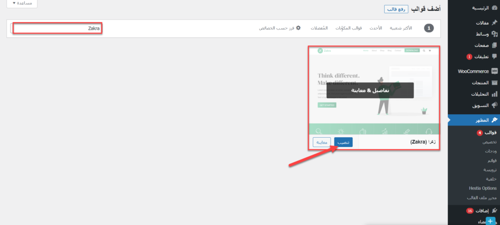 وبعد ذلك تقوم بالبحث عن اسم القالب الذي نال إعجابك من القوالب السابقة وكافة القوالب السابقة مجانية لذلك ستجدها ضمن متجر الووردبريس، على سبيل المثال نبحث عن قالب Zakra متعدد الاستخدام، وبعد البحث سيظهر لك القالب مع إمكانية المعاينة المباشرة على الموقع أو التنصيب وذلك كما موضح في الصورة التالية: