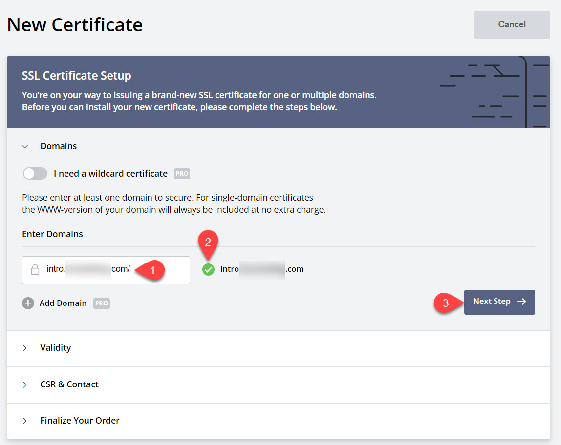سيظهر لك معالج إعداد شهادة SSL. أدخل اسم الدومين الخاص بك في حقل (Enter Domain) الموجود ضمن قسم (Enter Domains)، ثم بعد ذلك انتظر بضعة ثوانٍ حتى يظهر بجانب اسم الدومين صح أخضر، ثم انقر على زر (Next Step) للانتقال إلى الخطوة التالية.