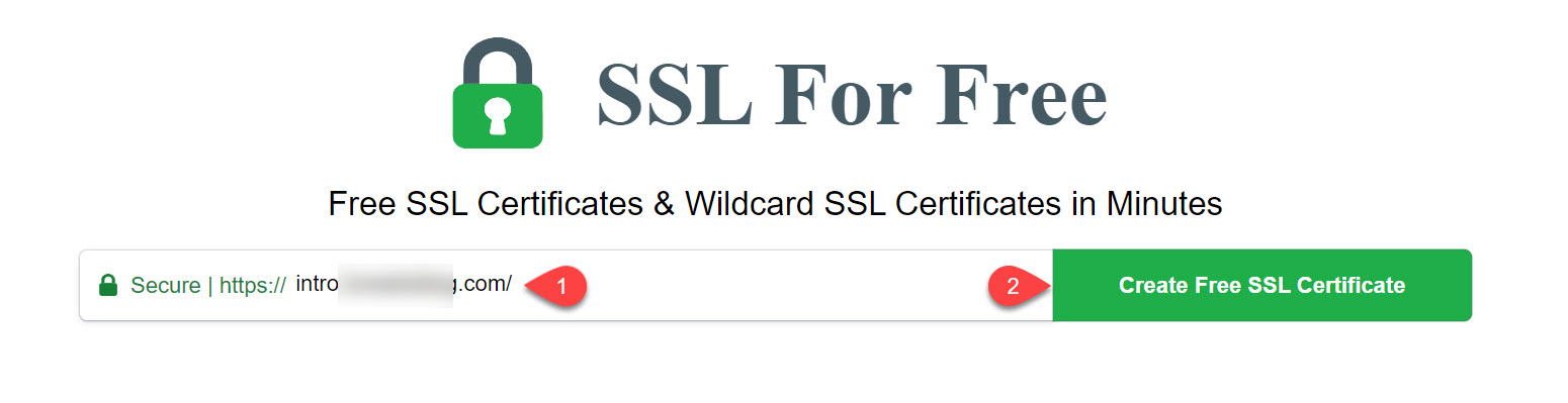 سنشرح فيما يلي كيفية الحصول على شهادة SSL مجانًا بالاعتماد على مزود SSL For Free الذي يعد من أفضل المزودين الذي يقدمون الشهادة مجانًا.توجه إلى موقع SSL For Free، ثم أدخل اسم الدومين الخاص بموقعك ضمن مربع النص الذي يظهر، وبعد ذلك انقر على زر (Create Free SSL Certificate) الموجود بجانبه.