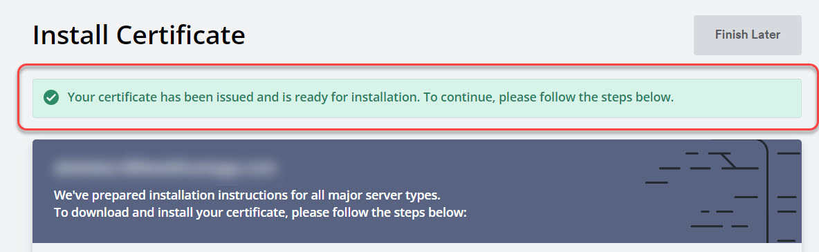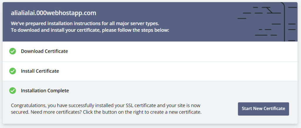 إذا قمت بتنفيذ الإرشادات بشكل صحيح، فسيتم خلال ثوانٍ قليلة إعلامك أن شهادة SSL المجانية قد تم إصدارها، وهي جاهزة للتثبيت.