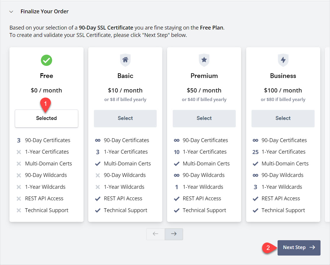 ستنتقل مباشرة إلى قسم إنهاء الطلب (Finalize Your Order)، حيث عليك تحديد الخطة التي تريدها. بما أنك تريد الحصول على شهادة SSL مجانية، اختر الخطة (Free)، ثم انقر على زر (Next Step).