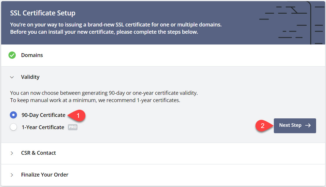 ستنتقل إلى قسم (Validity) الذي يتضمن خيارات تحديد صلاحية شهادة SSL. عليك تحديد خيار الصلاحية لمدة 90 يومًا وليس سنة، وذلك لأن الصلاحية السنوية غير متوفرة مجانًا، لذلك اختر (90-Day Certificate)، ثم انقر على زر (Next Step) للانتقال إلى الخطوة التالية.