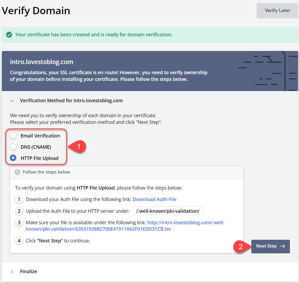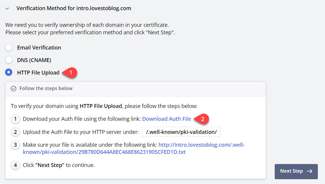 يوفر SSL for Free ثلاث طرق للتحقق من الدومين، وهي عبر الإيميل (Email Verification)، أو عبر DNS CNAME أو من خلال رفع ملف على الاستضافة (HTTP File Upload)، ويمكنك استخدام طريقة التحقق الأنسب لك، ثم تنفيذ خطوات التحقق، وبعد ذلك انقر على زر (Next Step).