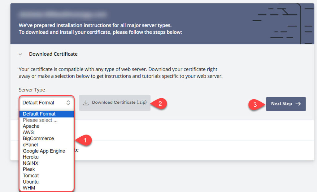كذلك سيتم مباشرة توجيهك إلى صفحة تنصيب الشهادة، ومن خلال تلك الصفحة عليك تحميل ملف الشهادة بالشكل الملائم لاستضافتك أو خادمك، وذلك عبر اختيار الخيار الملائم من قائمة (Server Type)، ثم النقر على (Download Certificate) لتحميل ملف بتنسيق ZIP يتضمن معلومات الشهادة على حاسوبك، وبعد ذلك النقر على (Next Step) للانتقال إلى الخطوة التالية.