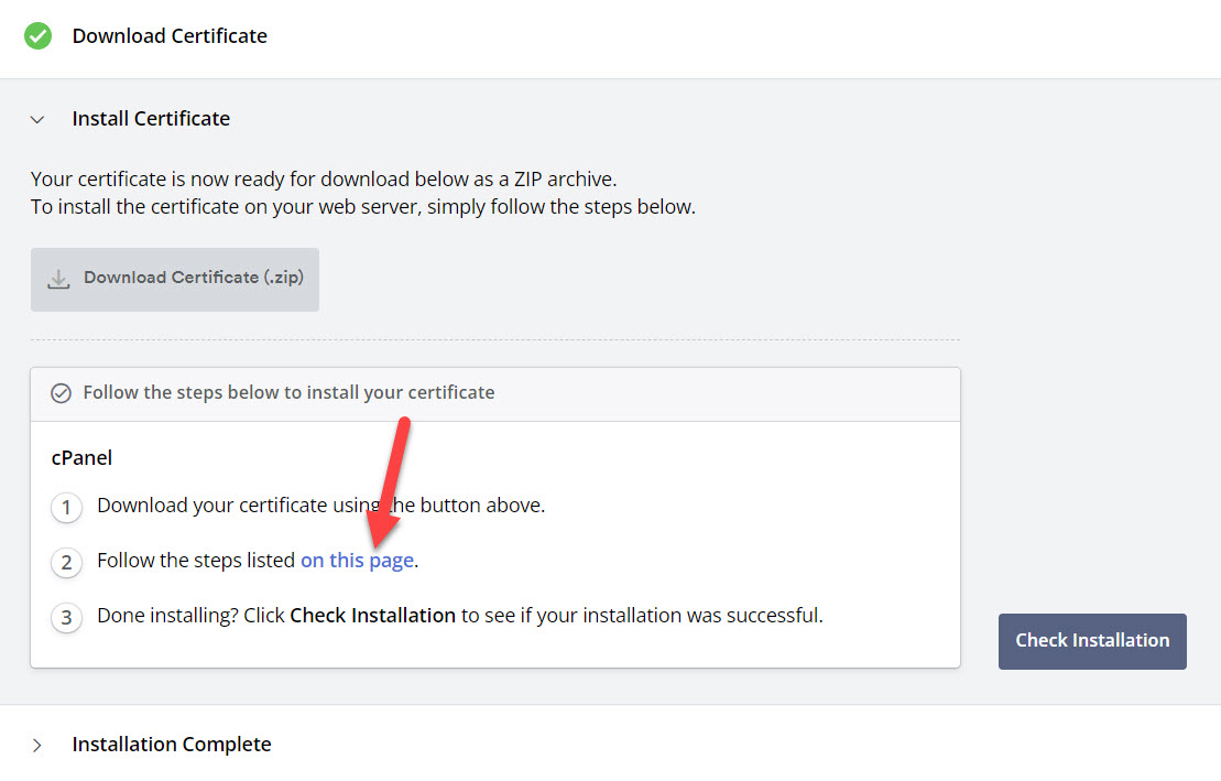 بعد تنصيب الشهادة كما هو موضح في المقالة التي انتقلت إليها بعد النقر على (on this page)، يمكنك النقر على زر (Check Installation) للتحقق من أنه تم تثبيت شهادة SSL المجانية بالشكل الصحيح، إذ ستظهر لك رسالة تفيد بأنه تمت عملية التثبيت بنجاح.