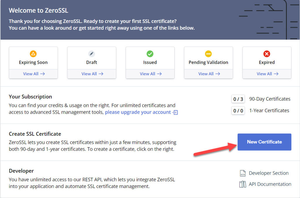 سيتم مباشرة توجيهك إلى لوحة التحكم التي يمكنك من خلالها الحصول على شهادة SSL مجانية لموقعك الإلكتروني وتثبيتها عليه. في لوحة التحكم تلك، انقر على زر (New Certificate).
