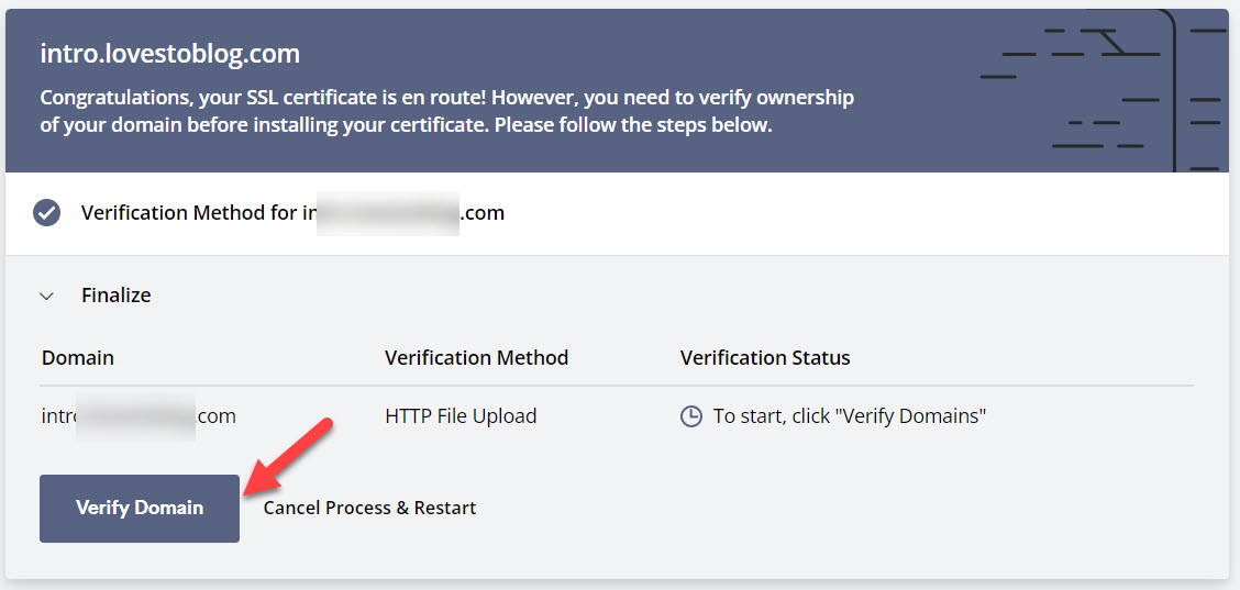 سيتم نقلك إلى صفحة التحقق من النطاق (الدومين)، إذ عليك إثبات أن الدومين الذي أدخلته هو ملكك، كما سيظهر إشعار باللون الأخضر يفيد بنجاح إنشاء شهادة SSL.