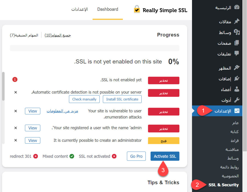 بعد ذلك توجه إلى تبويب (SSL & Security) ضمن تبويب (الإعدادات) في القائمة الجانبية في لوحة تحكم الووردبريس، ثم انقر على زر (Activate SSL)، حيث ستقوم الإضافة بتفعيل شهادة SSL المجانية على موقع الووردبريس مع تغيير كل ما يلزم لتصبح الشهادة فعالة بالشكل الصحيح.