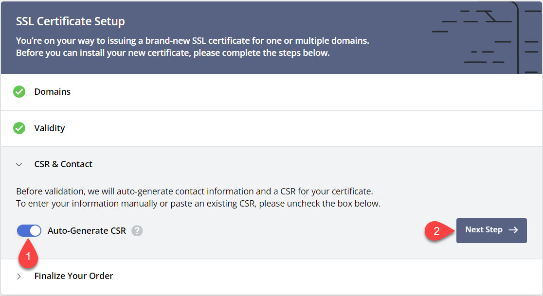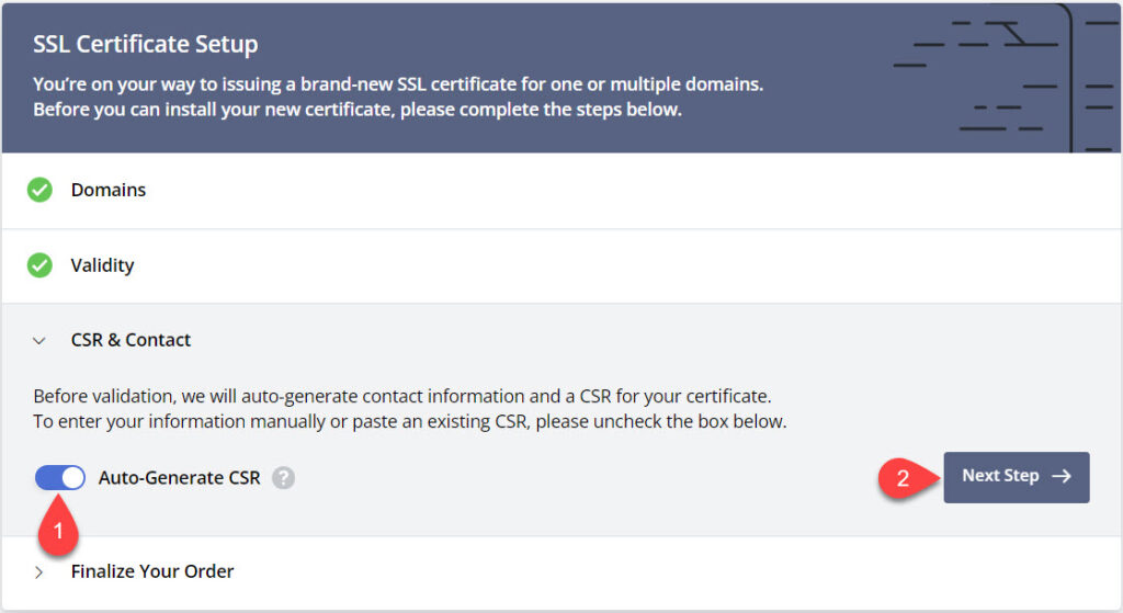 سيتم إظهار خيارات قسم (CSR & Contact)، وهي الخيارات المتعلقة بمعلومات الاتصال و ومعلومات CSR الخاصة بالشهادة. تأكد من تشغيل مفتاح (Auto-Generate CSR) لتوليد المعلومات المطلوبة تلقائيًا، أو قم بإلغاء تشغيله وأدخلها بنفسك، ثم انقر على زر (Next Step).