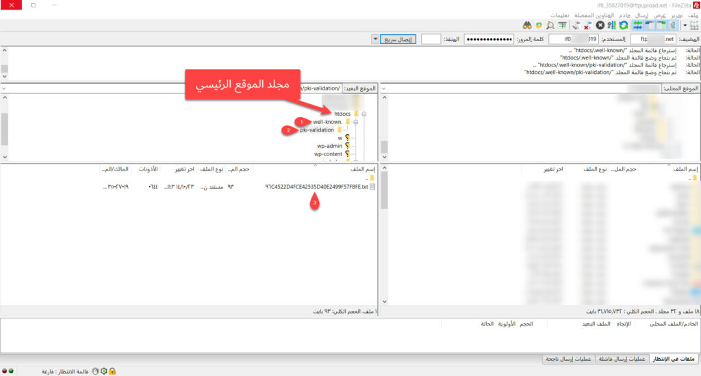 أي عليك أن تفتح مجلد الموقع الرئيسي لديك، ثم تنشئ مجلدًا داخله باسم (.well-known)، ثم تنشئ مجلدًا آخر داخل المجلد الأخير باسم (pki-validation)، وبعد ذلك ترفع ملف المصادقة داخله. يمكنك تنفيذ ذلك باستخدام اتصال FTP، أو عبر الاعتماد على مدير الملفات في لوحة تحكم الاستضافة.