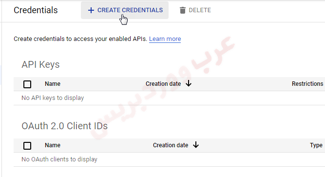 بهذا تكون فعّلت الـ API، وتحتاج الآن إلى إنشاء معرّفاتك الخاصّة. ولفعل ذلك ابدأ أوّلا بضغط Create Credentials.
