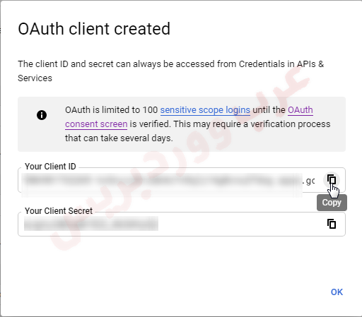 - ثمّ اضغط Create، لتظهر نافذة بها سطران يمثّلان Your Client ID وYour Secret. انسخهما، واحفظهما في مكان آمن، إذ سنحتاجهما لاحقا لربط هذا التّطبيق بالإضافة على الووردبريس.