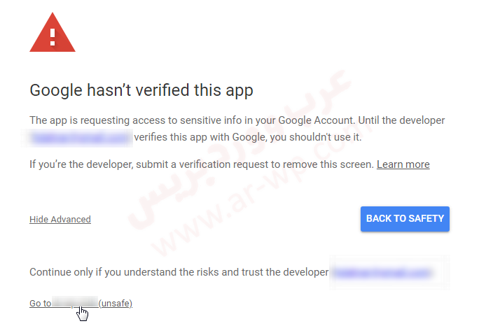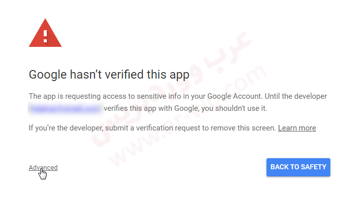- إذا ظهر لك خطأ Google Hasn't Verified this app، فاضغط Advanced