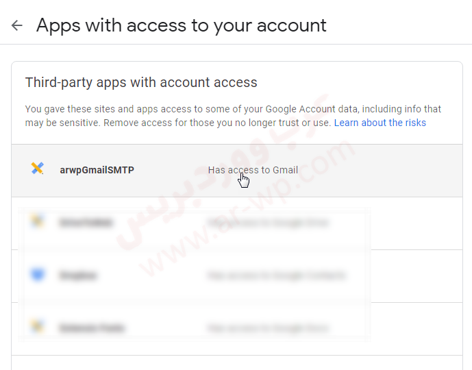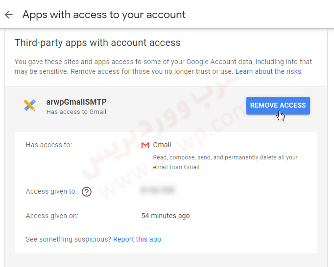 - اختر التّطبيق الّذي أنشأته لـ WP Gmail SMTP، واضغط بعدها Remove Access.