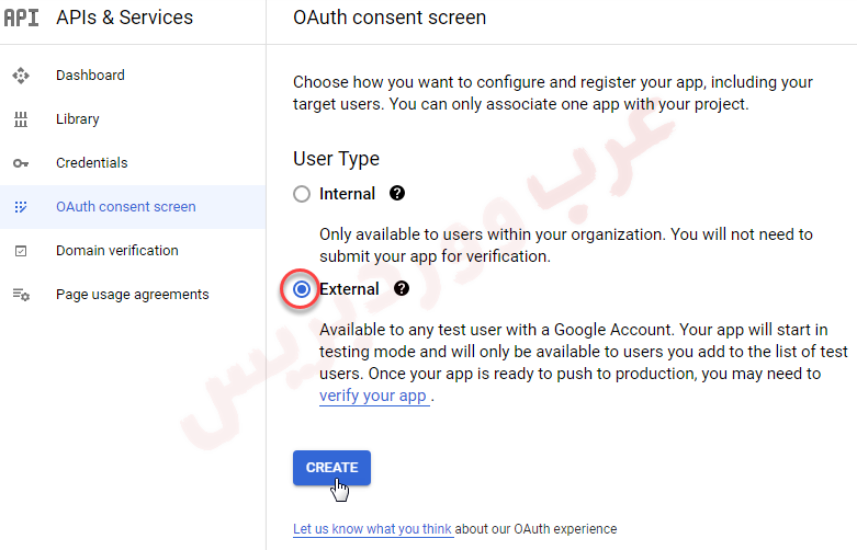 وبما أنّنا لا نستخدم G-Suite، اخترنا External. ثمّ اضغط Create.