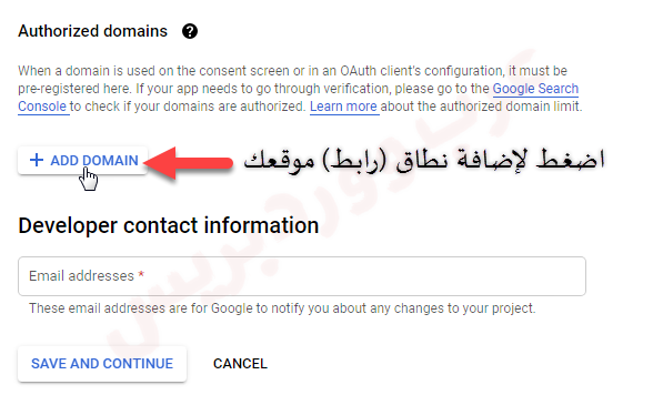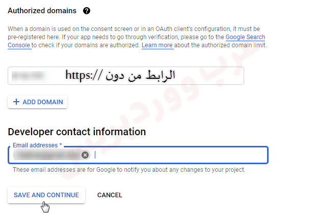ثمّ املأه برابط موقعه من دون //:https، واملأ خانة معلومات الاتصال ببريدك الإلكتروني الّذي ستستخدمه جوجل لإعلامك بأيّة تعديلات تطرأ على مشروعك. واضغط بعدها Save And Continue.