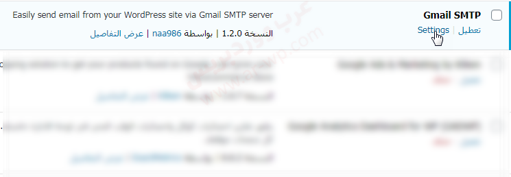 نواصل في صفحة "الإضافات"، ونبدأ كالتّالي: تحت الإضافة WP Gmail SMTP اضغط اختيار (الإعدادات) أو Settings.