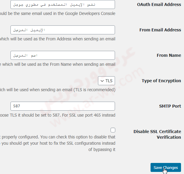 - مع اختيارك TLS املأ رقم البورت Port بـ 587.