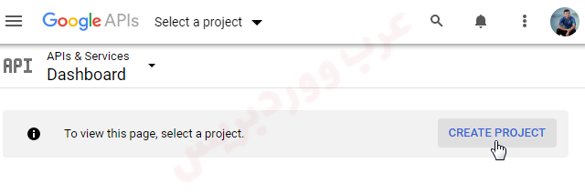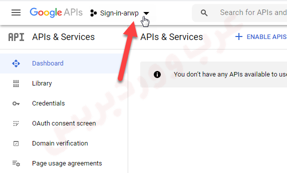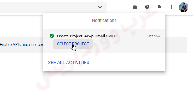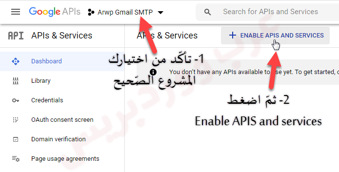 بعد التأكّد من اختيارك المشروع الصّحيح، اضغط من يمين الشّاشة Enable APIS and services.
