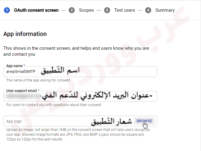 ستظهر لك صفحة معلومات التّطبيق، فاملأها بما يناسب من اسم للتّطبيق، وعنوان بريد إلكتروني للدّعم الفنيّ، وشعار للتّطبيق إذا شئت.