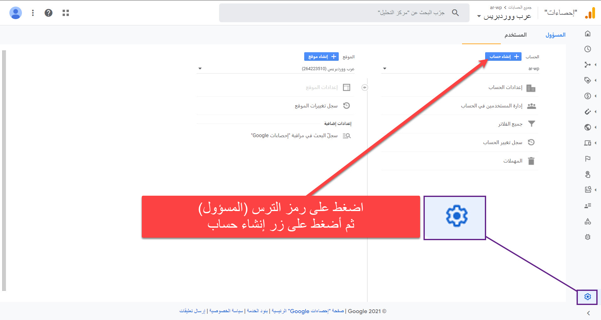 • في حالة كان لديك حساب ستتوجه مباشرة إلى داخل تحليلات جوجل، فقم بالضغط على رمز الترس (المسؤول) الموجود أسفل اليمين للنسخة العربية.