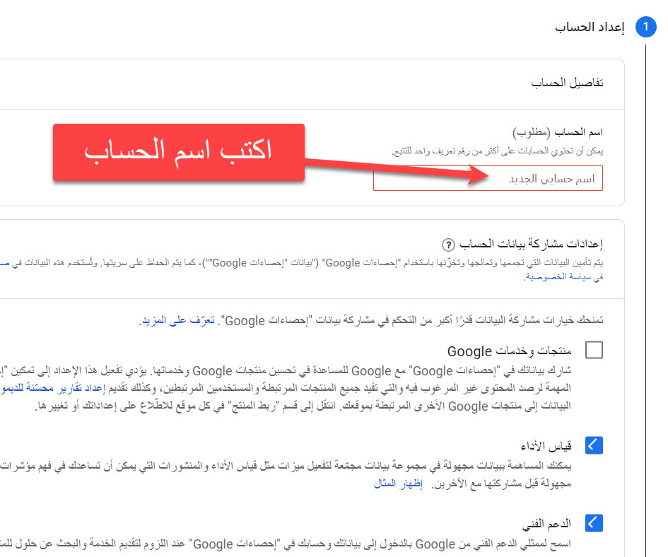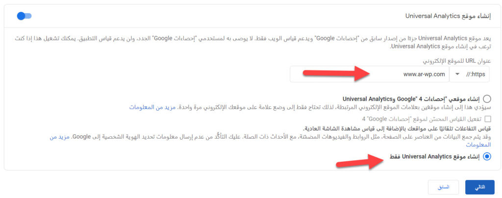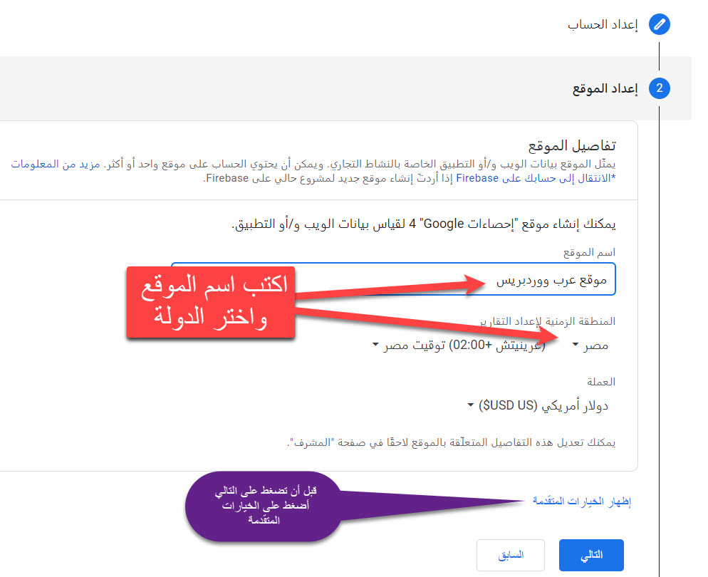 • اكتب اسم الحساب، ثم أضغط على التالي وستظهر لك الخطوة الثانية وهي إعداد الموقع وفيها تكتب اسم موقعك وتختار دولتك، ولكن قبل الضغط على التالي اختر الإعدادات المتقدمة في حالة أردت تثبيت Universal Analytics وهو النظام القديم من تحليلات جوجل.