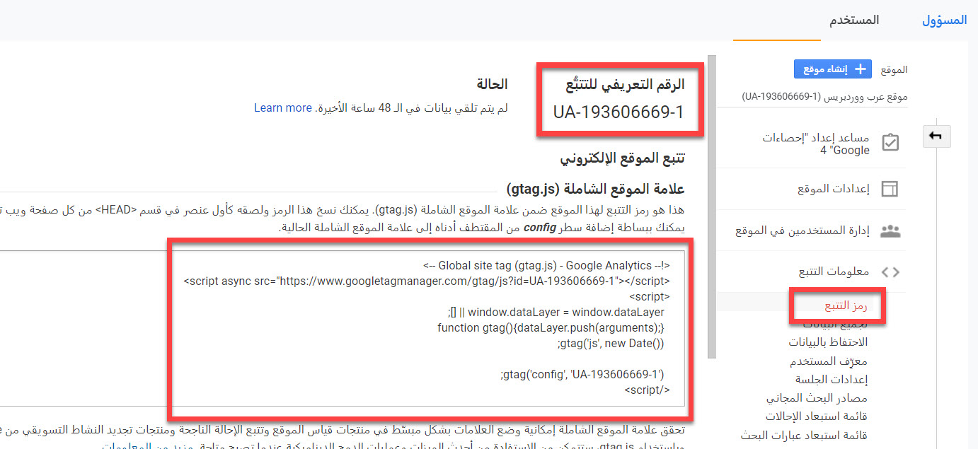 • نعود إلى صفحة جوجل أناليتكس وننسخ سكريبت Global Site Tags الذي حصلنا عليه في آخر صورة أعلاه.