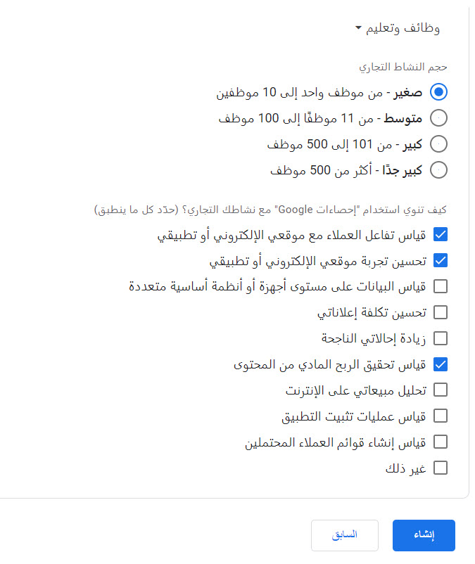 • ندخل بعض المعلومات الخاصة بتجارتنا وهدفنا من إنشاء الحساب.