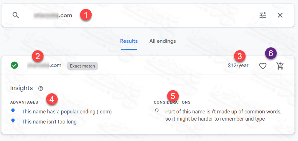 في الصورة السابقة بحثت عن دومين (1)، فأظهر لي Google Domain في الخانة رقم (2) أن الدومين الذي اخترته متاح للحجز بظهور أيقونة الصح المظللة باللون الأخضر وظهور كلمة Exact match والتي تعني أن الدومين متاح كما كتبته في مربع البحث.