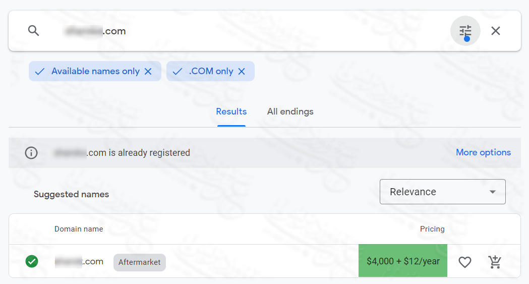 عبر الفلتر أعلاه اخترت عرض الدومينات المتاحة للحجز فقط المنتهية باللاحقة .com فظهر لي اقتراح واحد متاح وهو دومين سعره الحالي 4000 دولار، ثم يتم تجديده بعد سنة بسعر 12 دولار سنويًا.