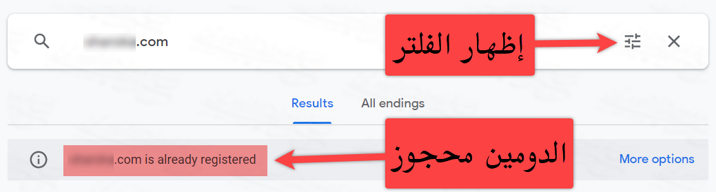 قد يكون الدومين الذي تريده محجوز من قبل، فإذا كان اسم النطاق الذي تريد شراؤه محجوز بالفعل سيظهر لك جوجل علامة تعجب وبجانب اسم الدومين جملة is already registered، كما هو موضح في الصورة التالية.