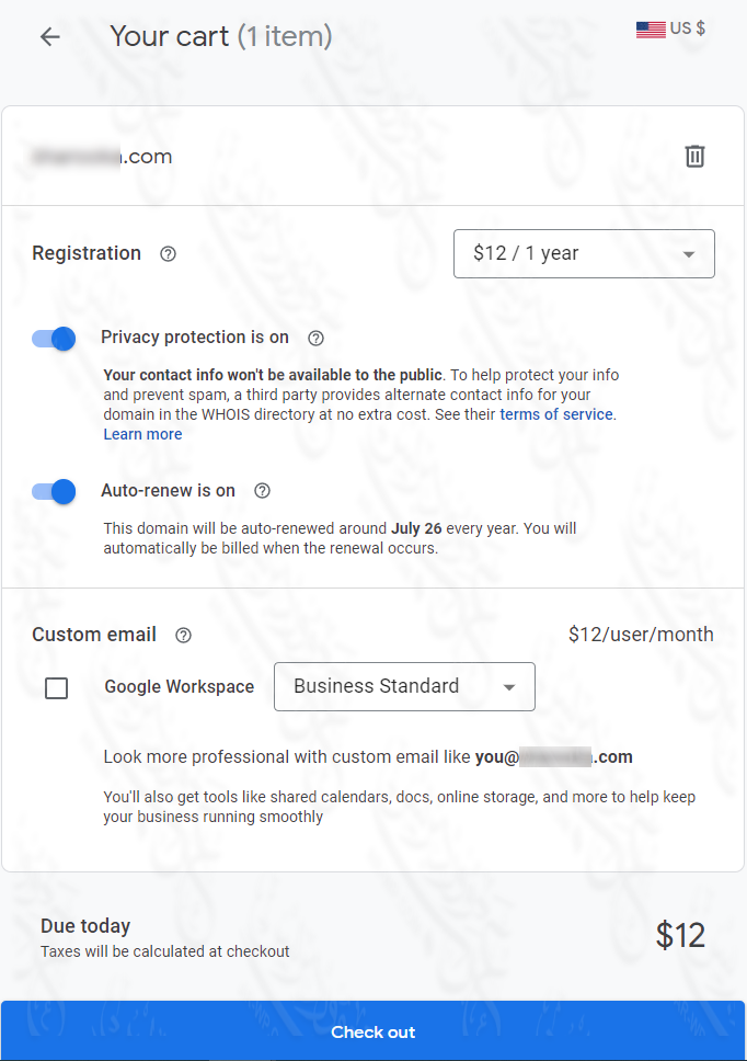 في حالتي لن أحتاج للإيميل المخصص، ولذلك سأترك خانته فارغة الآن وسأضغط مباشرة على Check Out لإكمال شراء النطاق من Google Domains.