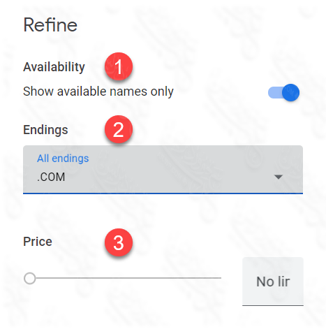- الخيار الثالث وهو خيار Price يمكنك من تحديد سعر محدد لتظهر النطاقات في حدود هذا السعر علمًا أن أسعار النطاقات الجديدة في جوجل كلها تساوي 12 دولار لمدة عام، بينما هناك نطاقات محجوزة من قبل يبيعها أصحابها بأسعار أعلى.