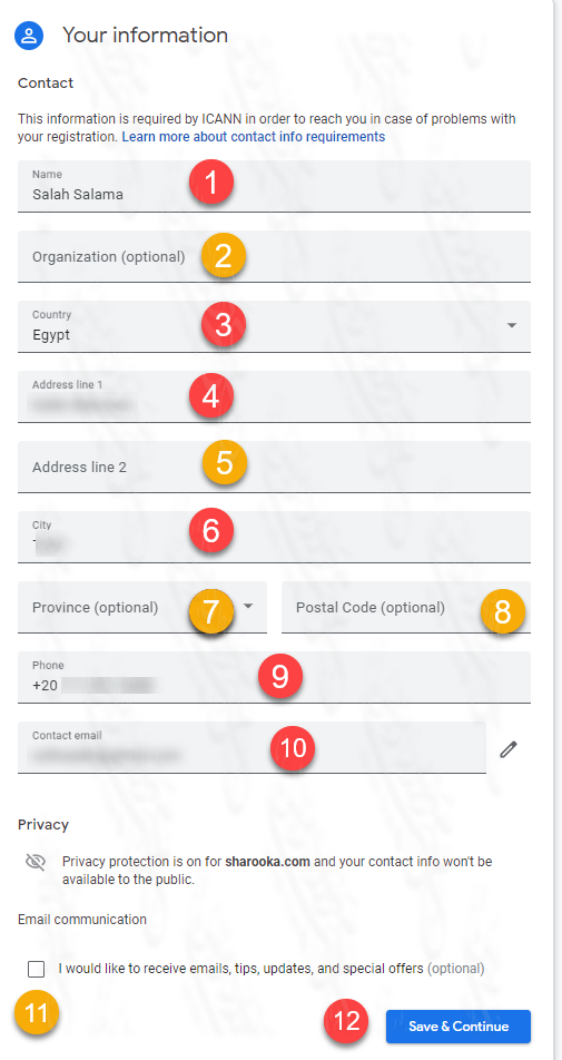 إذا كانت هذه أول مرة لك في جوجل دومين، فسيطلب منك إدخال بياناتك الشخصية في جزئية Your Information.