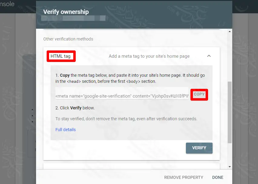 الآن، سيُطلب منك إثبات ملكية موقع الويب الخاص بك. هناك عدة طرق للقيام بذلك، لكننا سنعرض طريقة وسم (HTML Tag) لأنها أسهل طريقة.