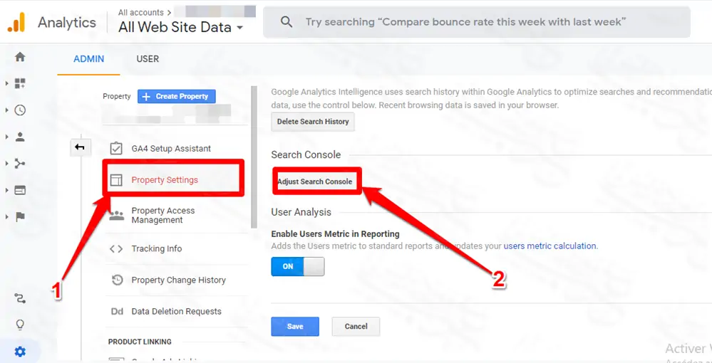 سيتحول Google Analytics الآن إلى عرض لوحة تحكم المدير. من هنا تحتاج إلى النقر فوق قسم إعدادات الموقع (Property Settings) ثم النقر فوق الزر (Adjust Search Console)