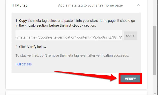 الآن، تحتاج إلى إضافة العلامة الوصفية للتحقق من موقع جوجل في ووردبريس، حتى تتمكن Google من التحقق من أنك مالك موقع الويب.