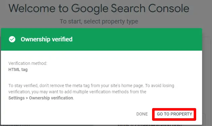 هذا كل شيء. لقد نجحت في إضافة موقعك إلى أدوات مشرفي المواقع (Google Search Console). يمكنك الآن النقر على رابط الانتقال إلى الموقع (Go to Property) لزيارة لوحة تحكم (Google Search Console).