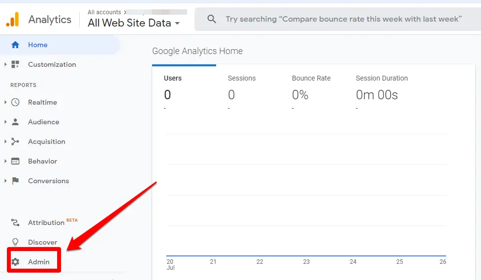 توجه إلى لوحة تحكم Google Analytics لموقعك على الويب. من الركن الأيسر السفلي من الشاشة، انقر فوق زر المدير (Admin).