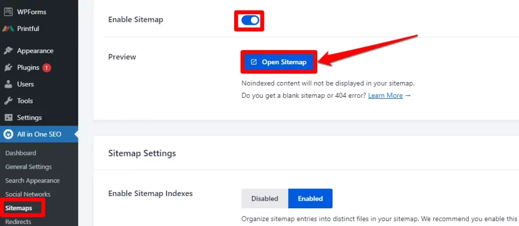 لمشاهدة خريطة موقعك، انتقل إلى تبويبة (All in One SEO)، ثم انقر على خرائط المواقع (Sitemap). من هنا، يمكنك أن ترى أن خريطة الموقع ممكّنة تلقائيًا لك.