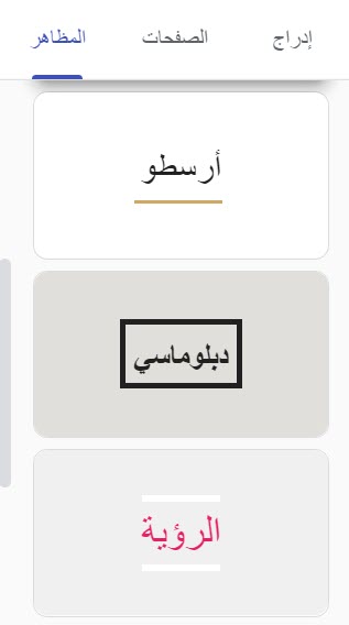 - أما ثالث الأقسام، فيتضمن 3 علامات تبويب هي: إدارج - الصفحات -المظاهر، ونوضح تاليًا الخيارات التي تتضمنها هذه الأقسام: